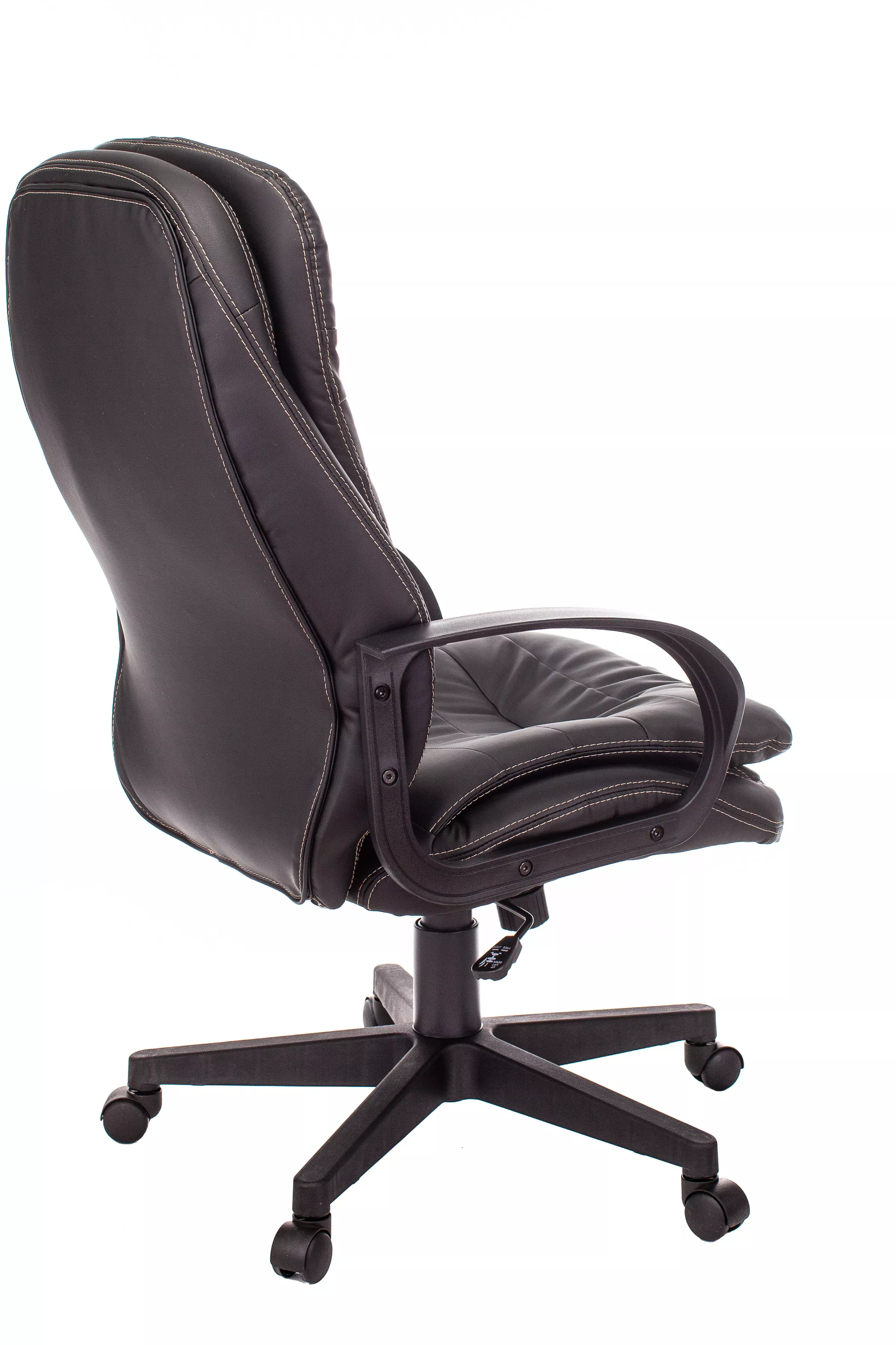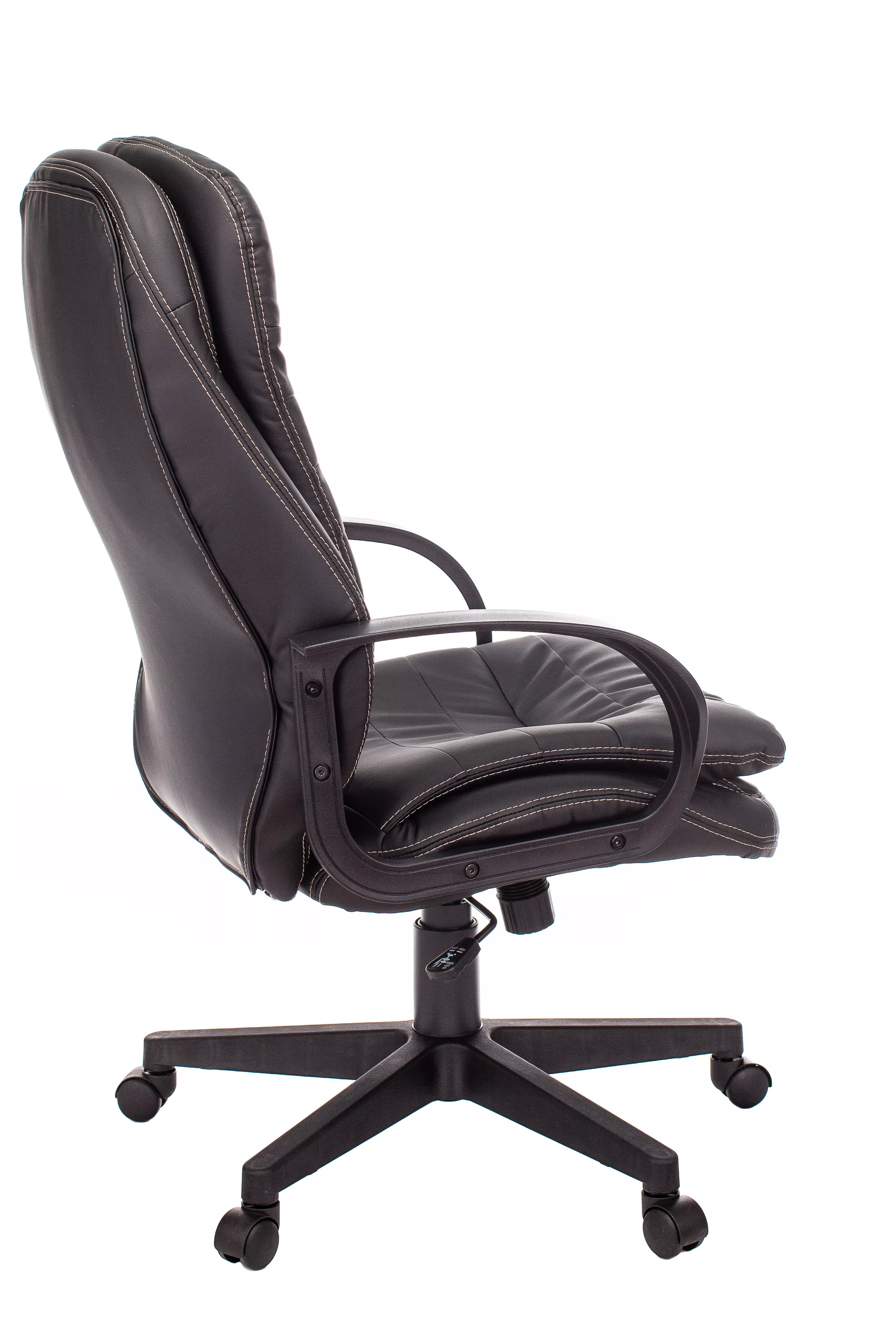 Обивка кресла выполнена из высококачественной экокожи черного цвета, которая не только стильно смотрится, но и легко чистится. Спинка кресла отделена от сиденья, что позволяет обеспечить лучшую вентиляцию и комфорт при длительном сидении. Высота кресла варьируется от 1065 мм до 765 мм с подлокотниками, а высота сиденья составляет 495 мм. Ширина сиденья — 565 мм, а глубина — 460 мм, что обеспечивает достаточное пространство для комфортного размещения.
